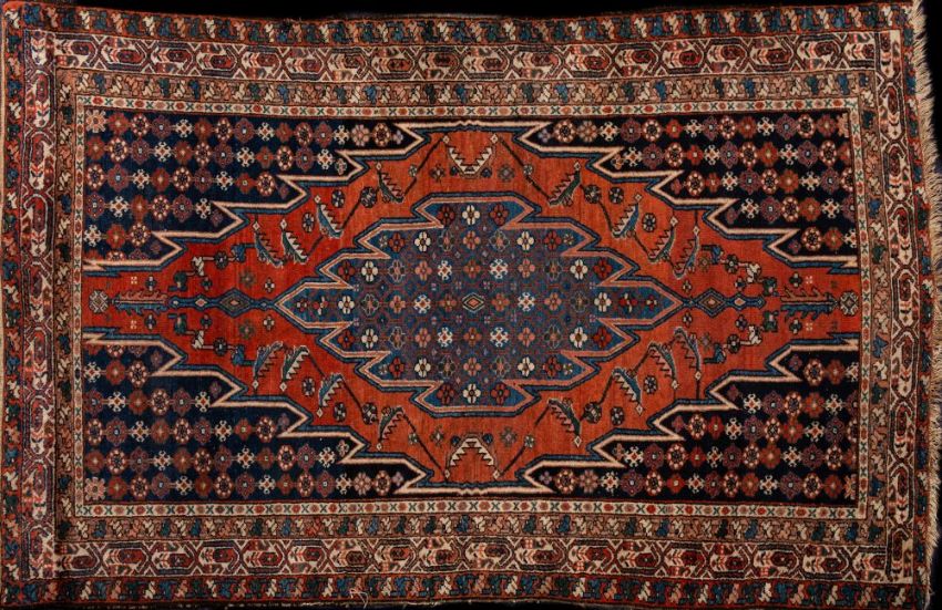 A Mosuleghan Hamadan rug:, the brick red serrated field with a central powder blue serrated medallion with flowerhead lattice designs, having indigo spandrels and main beige boteh geometric border, 198cm x 126cm.