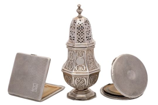 A Victorian silver sugar caster, maker George Nathan & Ridley Hayes, Chester 1899/1900: of octagonal baluster form, 14.5cm high, together with two silver compacts, weighable silver 170gms, 5.47ozs.