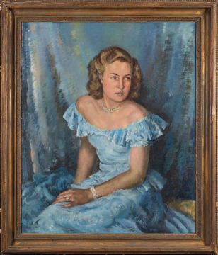 * Francis Wynne Thomas [1907-1989]-Portrait of Moira Major, three-quarter length seated,:-with wavy fair hair, wearing a blue chiffon dress, pearls, a sapphire engagement ring and gold wedding bandsigned top left, oil on canvas, 91 x 76cm.