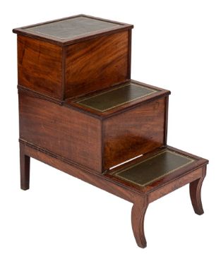A Regency mahogany step commode:, the three treads with tooled leather inset panels, having a hinged upper step with box interior and a hinged centre step enclosing a sliding interior fitted with a ceramic liner and cover, on reeded sabre front legs, 74.5cm (2ft 5 1/4in) long.