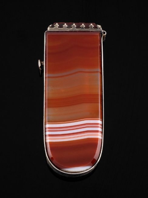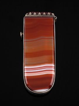 A late Victorian polished banded agate vesta case: of rectangular outline, with hinged lid and agate strike pad, 7cm long.