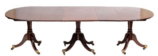 A Regency and later mahogany D-end triple pillar dining table:, the top with a reeded edge, on turned column uprights, the centre section on quadruple splayed legs, the D-end sections on tripod splayed legs, terminating in brass cappings and castors, including two additional centre leaves, the top 120cm (3ft 1 1/4in) x 192cm (6ft 3 1/2in) and with two additional leaves extending to 270cm (8ft 10 1/4in).