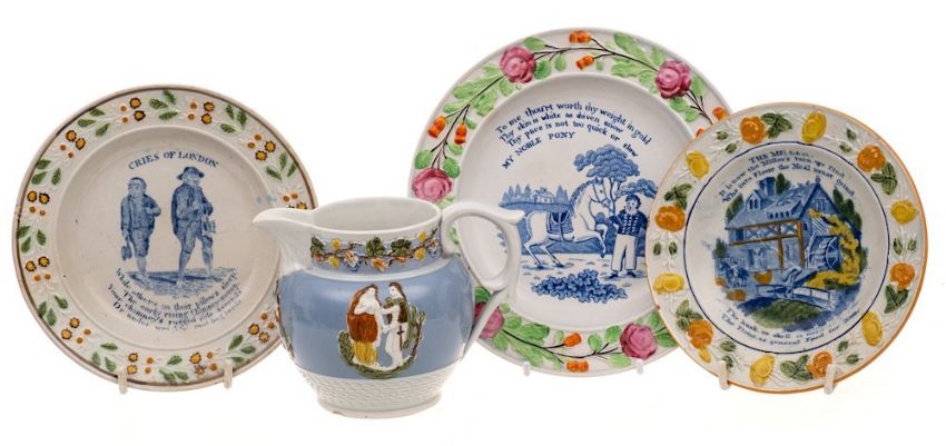 A Single Owner Collection of 19th Century Childrens' 'Nursery' Plates A group of three pearlware nursery plates and a small Pratt decorated moulded pearlware jug: the plates 'Cries of London', 'The Miller' and 'My Noble Pony' printed in blue within relief moulded borders painted in Pratt and other colours, circa 1820-30, 14-17cm [the first two plates with minor damage] 4.