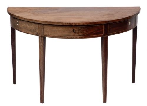 A pair of George III mahogany and inlaid D-end sections of a dining table:, bordered with boxwood lines, the friezes each fitted with a drawer, on square tapered legs, 122cm across.