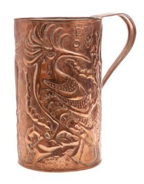 An Arts & Craft embossed copper mug: decorated with crested birds, crown, sun and Greek letters, with swept handle to the side, 22.5cm high.