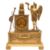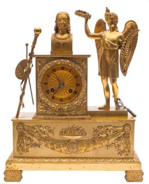 A French ormolu figural mantel clock: the eight-day duration movement striking the hours and half-hours on a bell with an outside countwheel and silk suspension, the backplate stamped with the serial number 56, the round ormolu dial having black Roman hour numerals, blued steel moon hands and an engraved engine-turned centre, the ormolu case having a bust of Raphael surmounting a plinth with artists materials leaning against one side and a classical female figure standing to the other with a wreath to anoint the bust, with a further plinth having applied classical mounts and standing on matching feet, height 35cm.