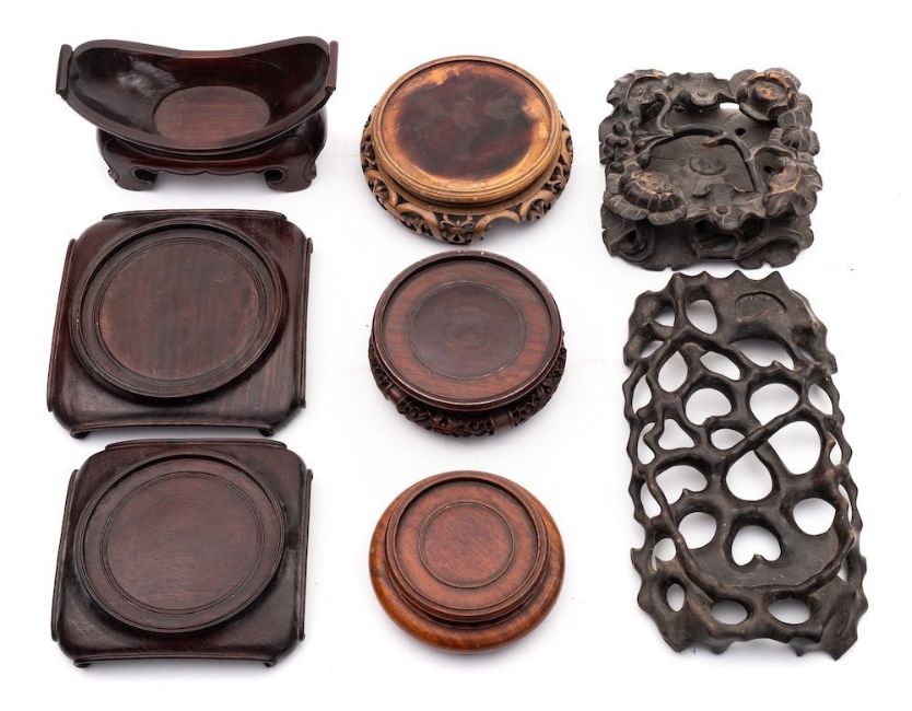 A collection of eight Chinese carved hardwood and other stands: including a graduated pair of square stands with foliate sides and feet, 18 and 24cm [8].