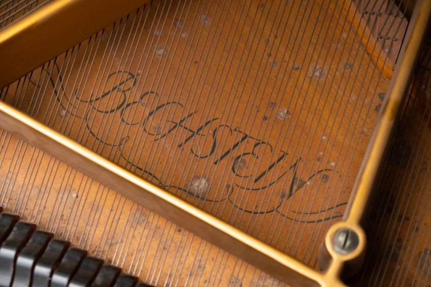 A cased baby grand piano by C Bechstein:, no. 239946, overstrung steel frame, cartouche shaped music rest, raised on square tapering legs, terminating on cup casters, 139.5cm, together with an Edwardian ebonised rectangular adjustable piano stool (2).