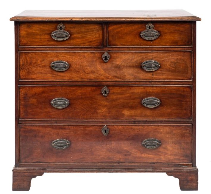 A George III mahogany rectangular chest: the top with a moulded edge containing two short and three long drawers on bracket feet, 96cm (3ft 1 3/4 inches) wide