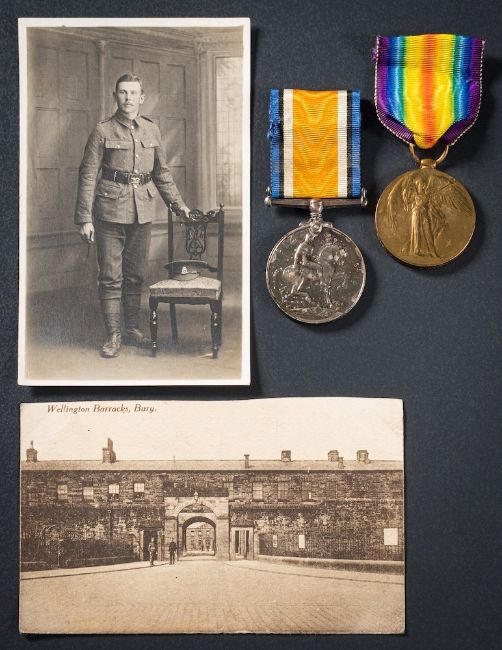 A World War One pair to 20650. Pte. E.B. Langdon, Lan. Fus: War and Victory medals, together with a postcard of the recipient and a view of Wellington Barracks, Bury. * Notes In reference to lot 937.