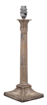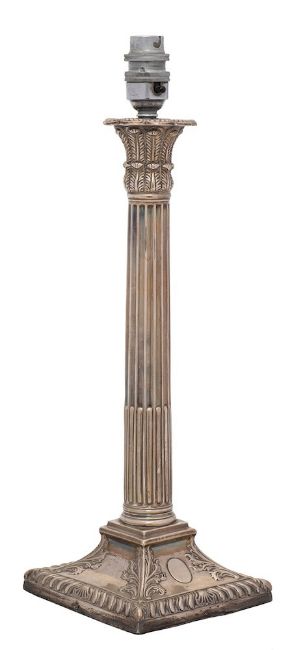 A George III silver column candlestick, maker's mark worn, London, 1770: with acanthus decorated capital, on a fluted column and square weighted base with gadrooned border, (now converted to electricity) 35cm high.