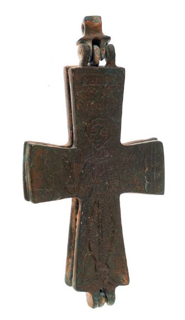 After the Antique; a bronze Reliquary Cross: with hinged suspension, with incised depiction of Christ 11cm long.