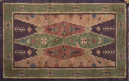 A Kelim flatweave:, the pistachio, serrated field with twin hooked lozenge medallions and powder blue, beige and rust serrated border, 233cm x 167cm, a Kelim flatweave with four cruciform pistachio medallions and main beige stepped border, 220cm x 140cm and a flatweave rug with pastel green, pink and lilac geometric field, 150cm x 95cm (3).