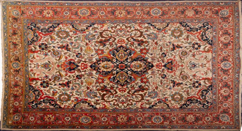 A Tabriz carpet:, the beige field with a central indigo pole medallion with palmette designs, all over palmette and floral foliate designs and indigo spandrels, enclosed by a main red palmette and floral foliate meander border, 373cm x 202cm.