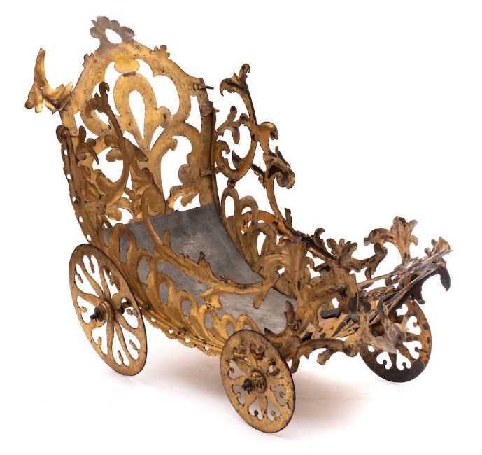 A 19th Century pressed metal and gilt decorated metal four wheeled carriage: the pierced foliate and scroll decoration to the sides and back, overall length 74cm.