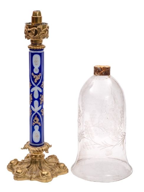 A 19th Century gilt metal and overlay blue glass storm lantern: the floral decorated capital on a blue and white glass column with gilded scroll decoration on a lobed and scroll decorated base, having a clear etched glass shade with vineleaf and grape decoration, overall height 68cm.
