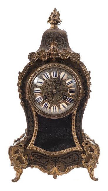 A French boulle mantel clock: the eight-day duration movement striking the hours and half-hours on a bell with the backplate numbered 23180, the cast brass dial having individual white enamel plaques with blue Roman numerals and blued steel cruciform hands, the waisted boulle case of brown tortoieshell inlaid with engraved brass to the front and sides, having a glazed front aperture to view the sunburst pendulum bob and surmounted by a cast-brass finial, on c-scroll cast-brass feet, height 31cm.