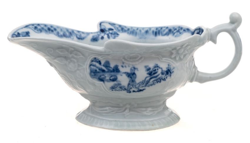 A rare First Period Worcester high-footed sauceboat: of rococo silver shape moulded with floral sprays, scrollwork panels and drapery, painted in the 'Bandit' pattern [I.A.22A], circa 1753-55, 16.5cm. * Provenance Zaki Ades Collection.