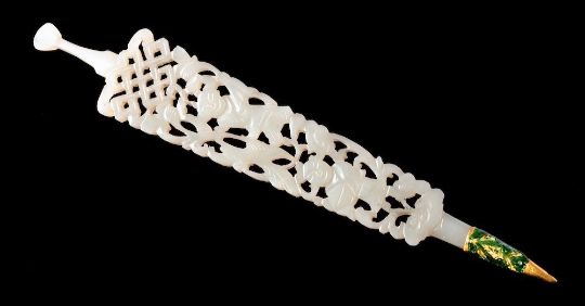A Chinese celadon jade and enamel ear wax spoon: carved and pierced with two figures amongst foliage, the pick in green enamel and gold, 15cm.