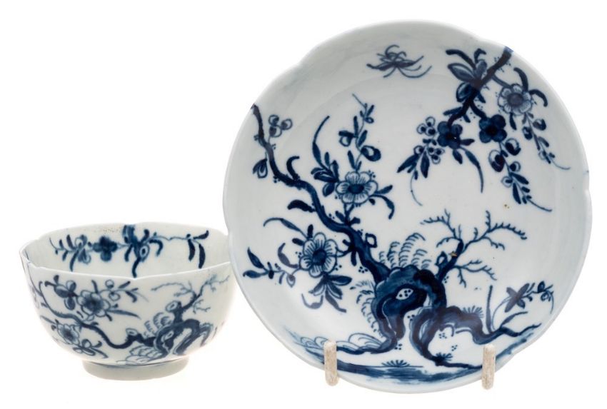 A single owner collection of early Worcester blue and white porcelain acquired from specialist dealers including Steppes Hill Farm Antiques and Albert Amor Ltd. The collection was formed over a twenty five year period from the late 1980s with the focus on rare patterns and fine unrestored condition.A First Period Worcester shaped teabowl and saucer: with delicate scallop shaped rims, painted in the 'Prunus Root' pattern [I.D.27], open crescent marks, circa 1760-65, diameter of saucer 12cm,*Notes Literature for all lots [see pattern nos.] Lawrence Branyan, Neal French and John Sandon 'Worcester Blue & White Porcelain 1751-1790'. Second Edition 1989.