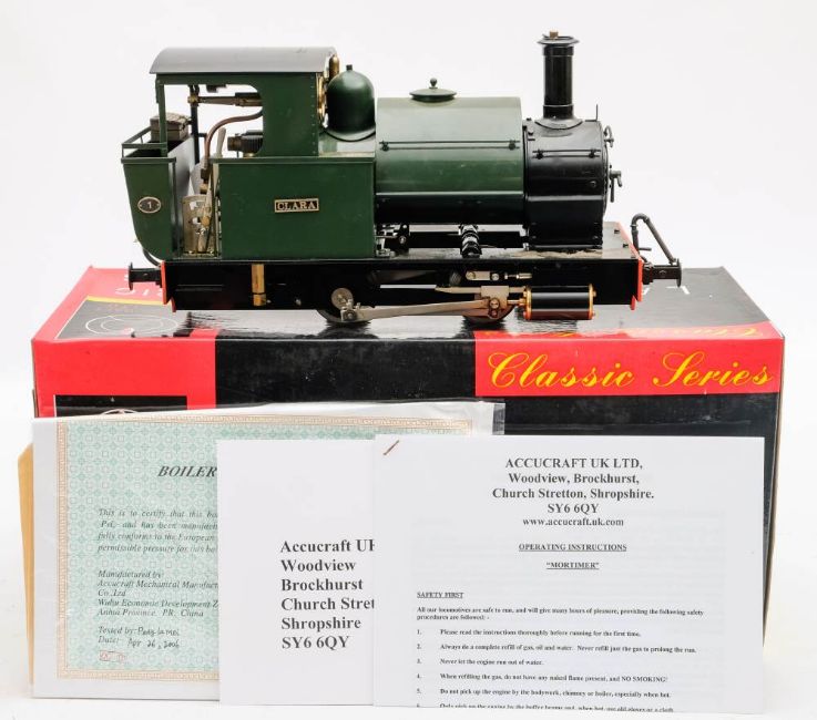 Accucraft Classic Series. A G gauge live steam MS0052 Mortimer 0-4-0 St locomotive 'Clara':, together with certificate dated April 26th 2006, with instructions in original box.