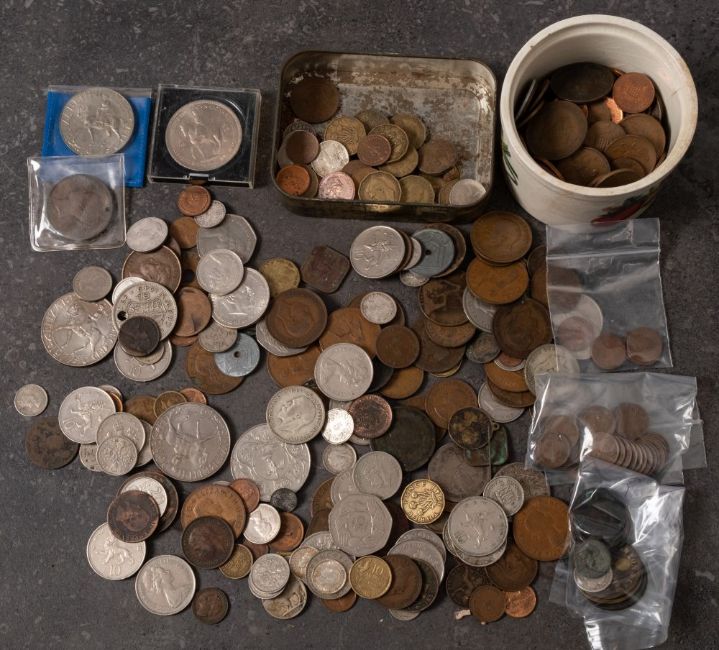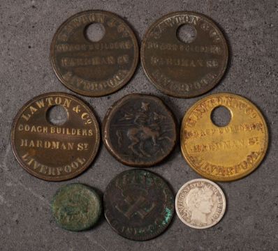 An accumulation of miscellaneous coins: including four numbered tags for 'Launton & Co Coachbuilders', Hardman Street, Liverpool', 1721 French Colonial copper coin, ancient Greek coin Syracuse copper horseman riding, etc.