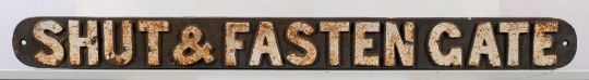 A cast iron sign 'Shut & Fasten Gate': white raised text, 7.5 x 80.5cm