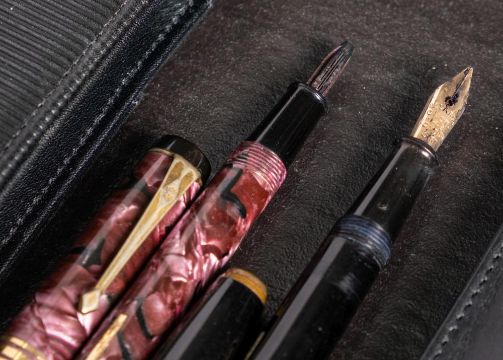 A Waterman fountain pen in blue marbled finish: together with a red marbled Conway Stewart No 388 fountain pen and a black Onoto lever pen (3)