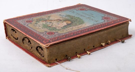 A late Victorian German 'Speaking Picture Book' distributed by H Grevel & Co, London: with lithograph pages of eight animals and nine pull cords reproducing corresponding sounds, 'the cock, the donkey, the lamb, the birds, the cow, the goat and the baby' on a wooden base with printed cloth bards, ( six pull strings still operational, boards worn)