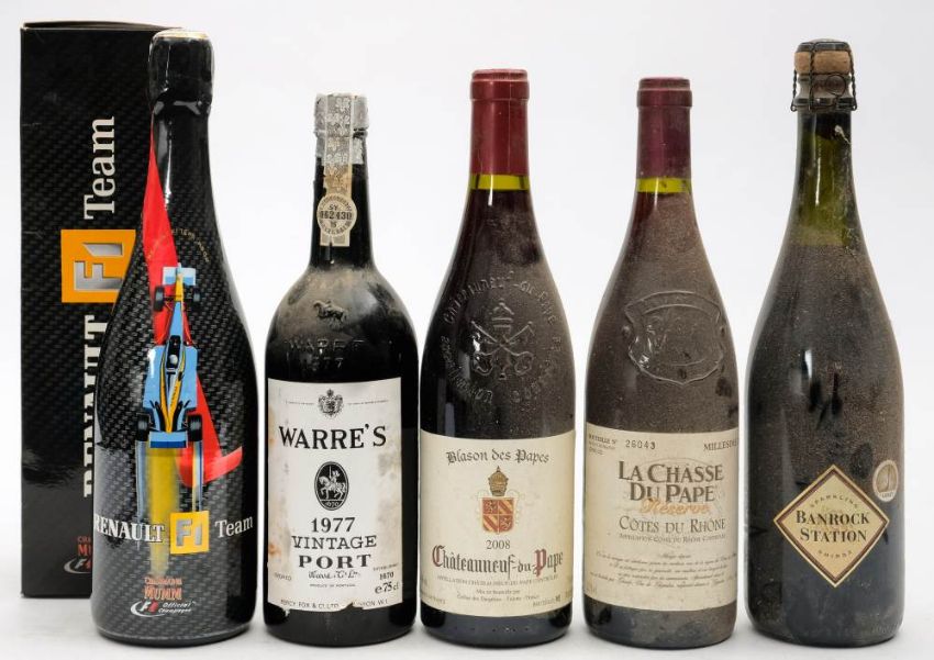 A bottle of Warre's 1977 Vintage port: together with a bottle of - Chateauneuf du Pape 2008, a bottle of Cotes du Rhone 2002, a bottle of Renault F1 Mumm Champagne and a bottle of Banrock Station Sparkling Shiraz.
