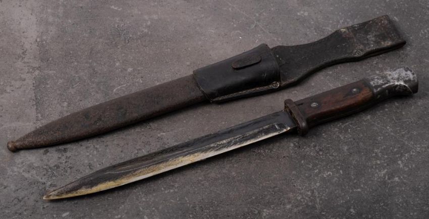 A WWII period German S84/98 bayonet: straight single edge fuller blade over steel hilt and two piece wooden grip, the steel pommel stamped with dropped wing waffenamt (pre-1938) inspector's mark in a black steel scabbard with black leather frog signed and dated 'Earnst Stutte 1937'; blade length 25cm.