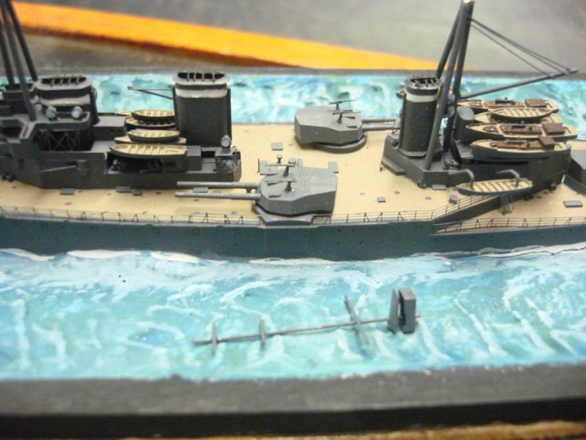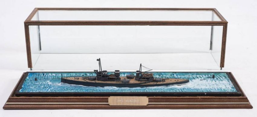 A cased waterline model HMS Invincible: with detailed decks on a painted base within a glazed case , 12 x 44 x 13.5cm