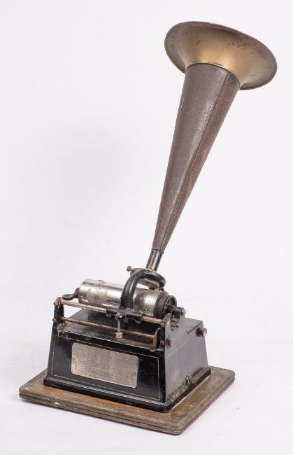 An Edison Type 1 'Gem' phonograph: with pressed lacquered brass horn over black lacquer and gilt body, type '3' Standard Patent plate, serial number 'G82235' , on an oak base ( lacks cover)