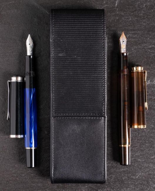 Two Pelikan (Germany) '200' piston filing fountain pens: one on smoked amber, the other in blue (2)