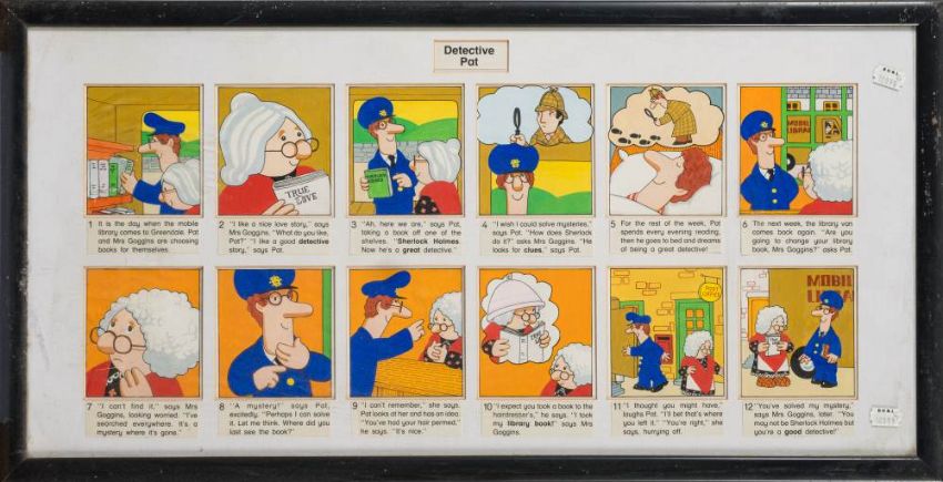 Peter Longden (1948-) & Joan Hickson (1929). Three sets of twelve watercolour original storyboard's of Postman Pat: comprising 'Pats Bright Idea', 'Detective Pat' and 'Chicken Skittle', each panel with text beneath, mounted in three frames, 34.5 x 71cm.