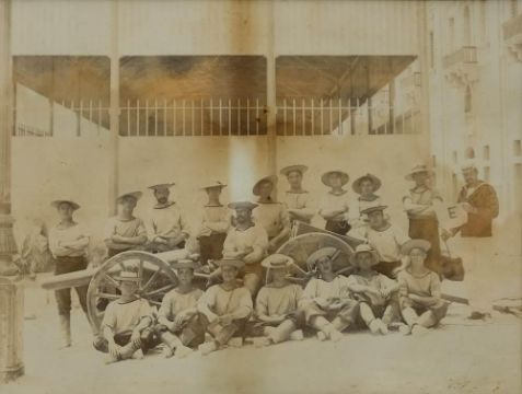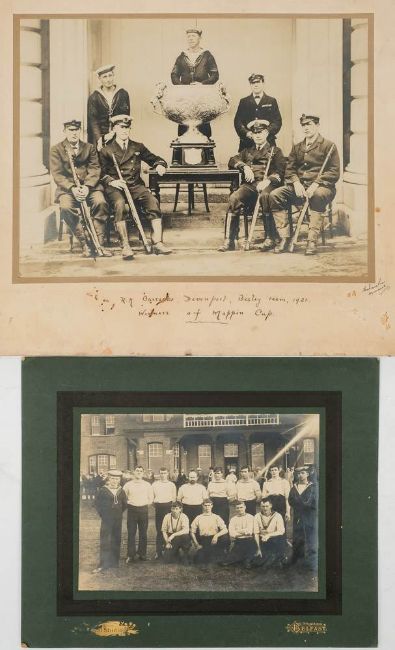 HMS Caeser.: An early 20th century photograph of ship's E company gun team, together with a photograph of RM Barracks Devonport, Bisley Team 1921. Winners of Mappin Cup' and one other photograph of a Royal Navy Tug-O-War team (3)*Notes- HMS Caeser was a Majestic-class pre-Dreadnought battleship launched in 1896. After service during WWI she served in the North American and West Indies Station.