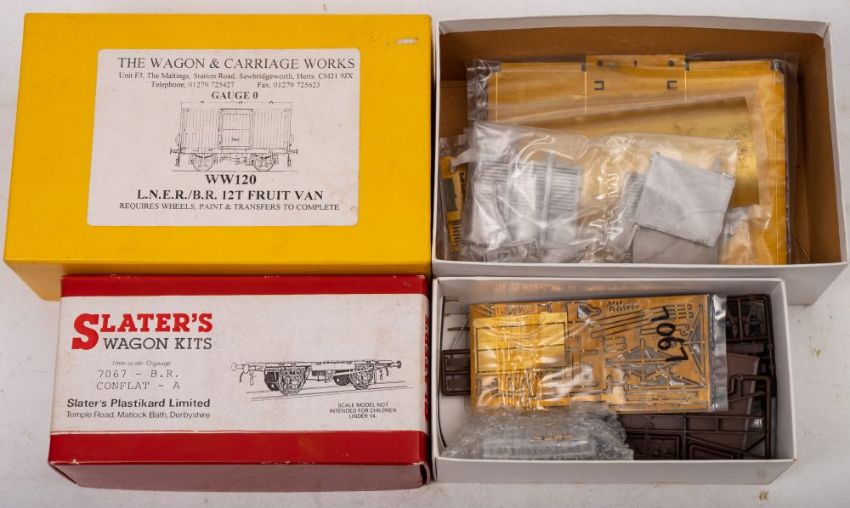 The Wagon & Carriage Works. O gauge WW120 LNER/BR 12t Fruit Van kit: in original box and a Slater's Wagon Kits 7067 BR Conflat kit (contents unchecked for completeness)