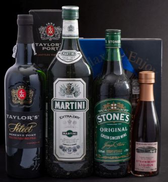 A bottle of Taylor's Vintage Port 2000: a bottle of Taylor's Select Reserve Port, a bottle of Martini Dry, a bottle of Stones Green Ginger wine, a half bottle of Cockburns Special Port, a half bottle of Harvey's Bristol Cream and a small bottle of Rosemary's Vineyard Strawberry Liqueur.