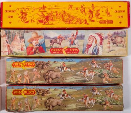 Crescent Wild West Series. Four boxes of Cowboys and Indians:, the boxes all with lithograph Wild West scenes to covers, mostly still strung in.
