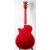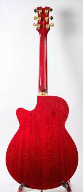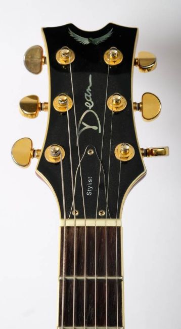 A Dean 'Stylist' hollow body semi-acoustic electric guitar: with gilt keys and dot fret markers, double humbucker style pickups, flame red body with white banding, together in a soft shell case.