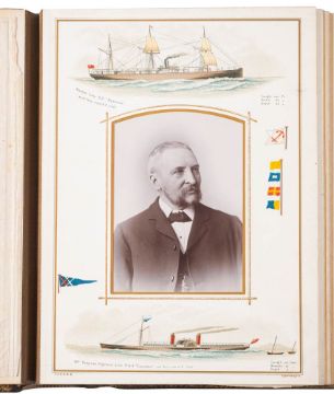 A Victorian 'British Marine' carte de visite album: with polychrome lithograph illuminated pages, gilt bordered leather binding, part filled with family portrait photographs, circa 1890s.