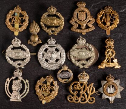 A small group of WWII cap badges: including Tank Regiment, RAC, Devonshire Regiment and others.