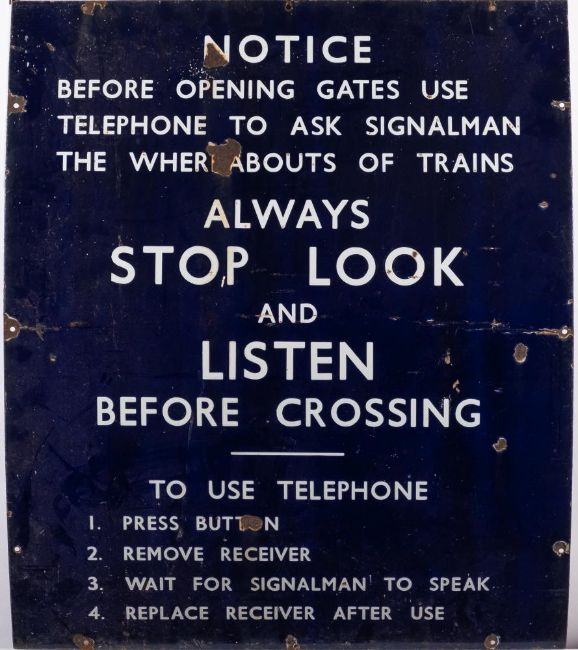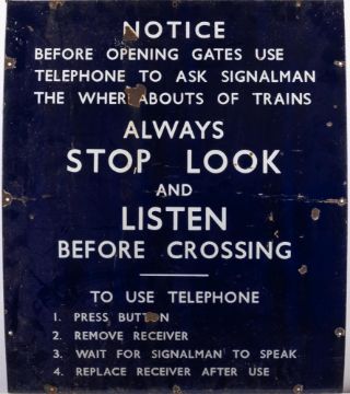 A BR(E) enamel crossing notice: white text on blue ground with instructions for contacting signalman before opening gates, 90 x 76cm. (damaged)
