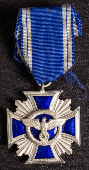 A Third Reich NSDAP Fifteen Years Long Service Award, Second Class: silver and blue enamel with ribbon in box of issue. (mildew to lower box exterior)