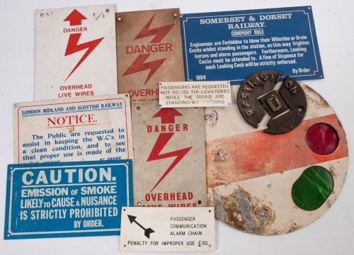 A group of railway orders and warning signs: together with a cast iron restriction plate (damaged) and an enamel shunt dial.