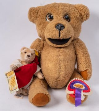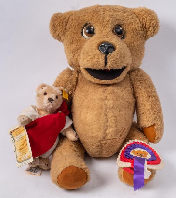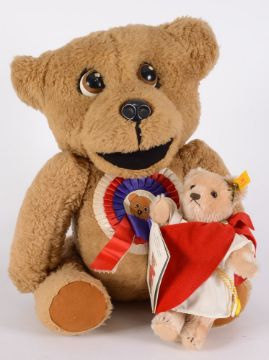 A Nooky Bear with moveable eyes and hand operated mouth:, 57cm. high, together with a Steiff Dodvoc 'Ruler of the Cotswolds' teddy bear 22cm. high.