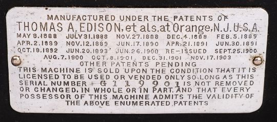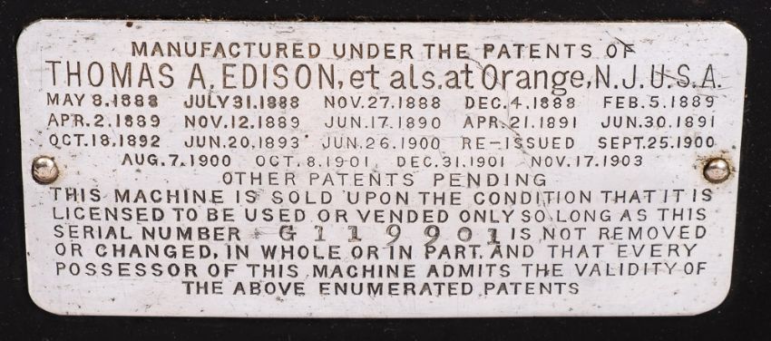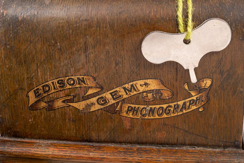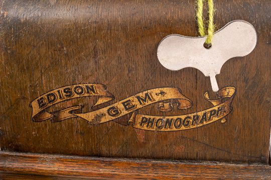 An Edison Type 1 'Gem' phonograph: with pressed aluminium horn over black lacquer and gilt body, type '3' Standard Patent plate, serial number 'G119901', in an oak case.