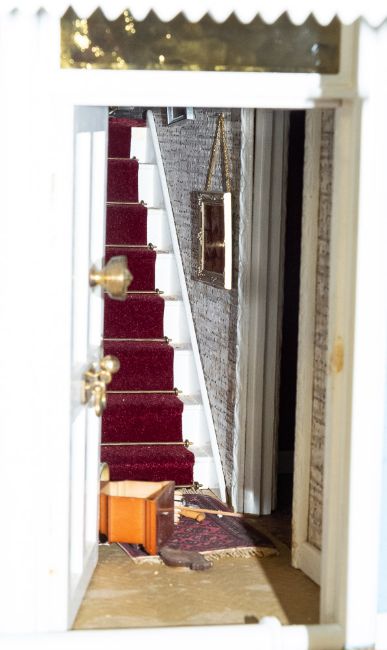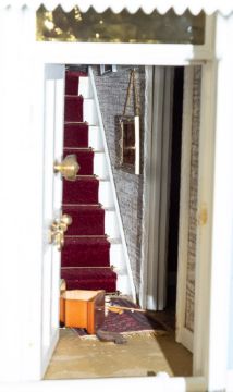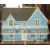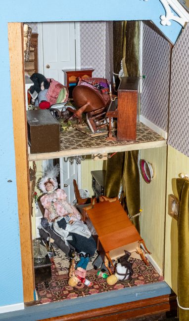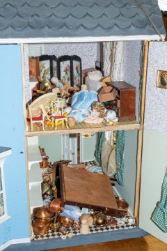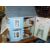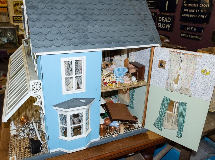 A large late 20th century Victorian style doll's house: with simulated slate roof over blue wall and white windows, enclosing ten rooms fitted with furniture, fixtures, fittings and dolls etc, wired for lighting. 96 x 118 x 82cm.