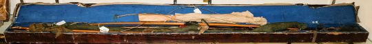 A late 19th /early 20th century horn tipped bow by Aldred, London,: together with one other horn tipped snakewood bow, stamped '52' a child's bow by Highfield, London and a group of accessories in a canvas covered bow case.