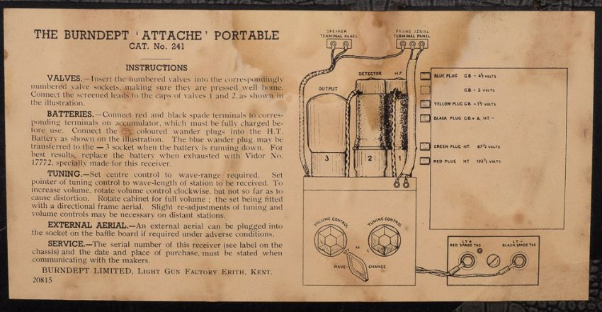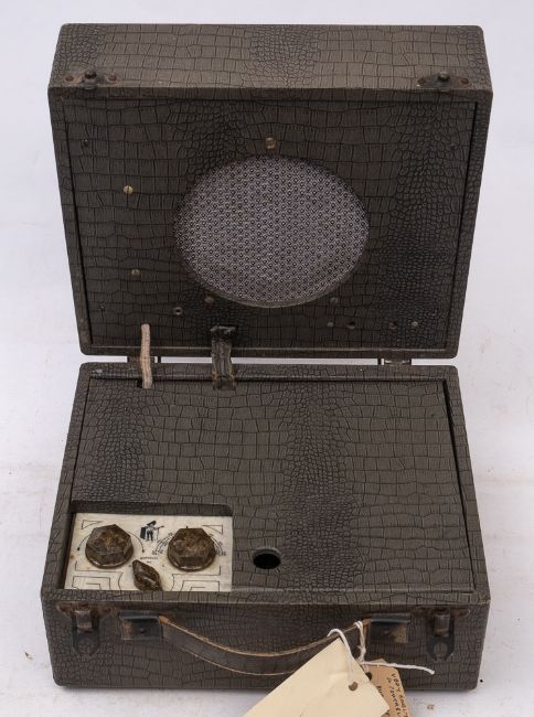 A Burndept Portable Model 241 'Attache' radio: in a grey simulated crocodile skin suitcase style case with bakelite knobs, serial number '03332' circa 1935., together with a Signal Corps Frequency Meter BC-221 (2)